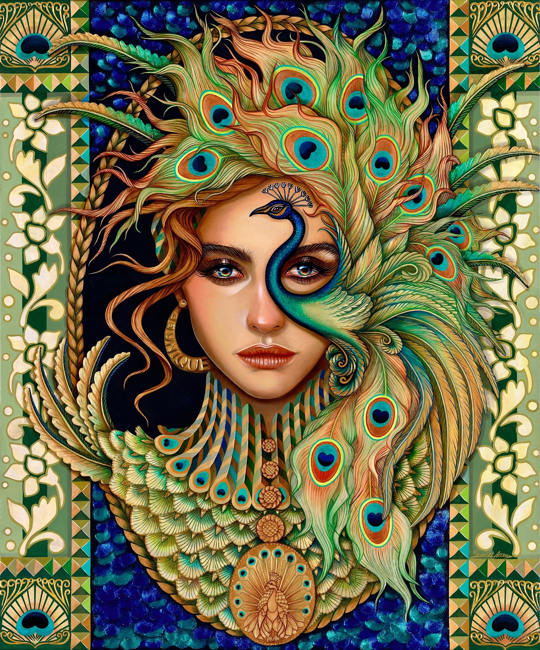 Let me introduce myself! I’m Scarlet, a contemporary artist creating distinctive portraits that celebrate feminine beauty and self-expression. Blending figurative art with a touch of surrealism and intricate decorative elements, my work is all about depth and detail, offering the viewer a unique visual experience.
